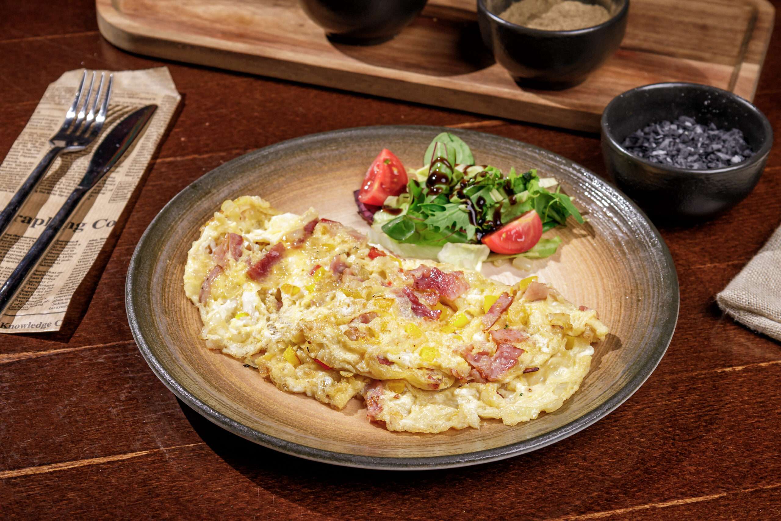 oua, bacon, ceapa, ardei gras, ciuperci, ulei, sare