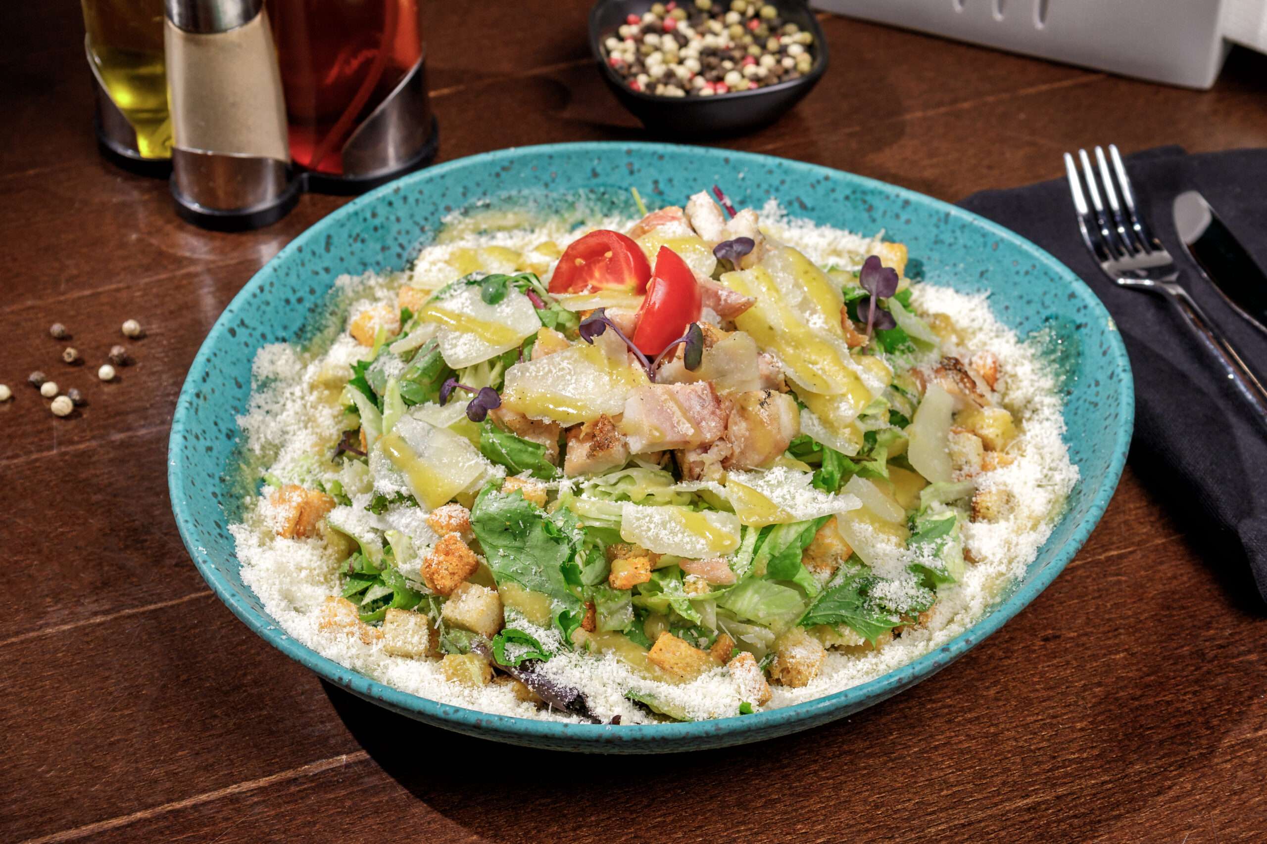salata verde, piept de pui la gril, crutoane, parmesan, dresing