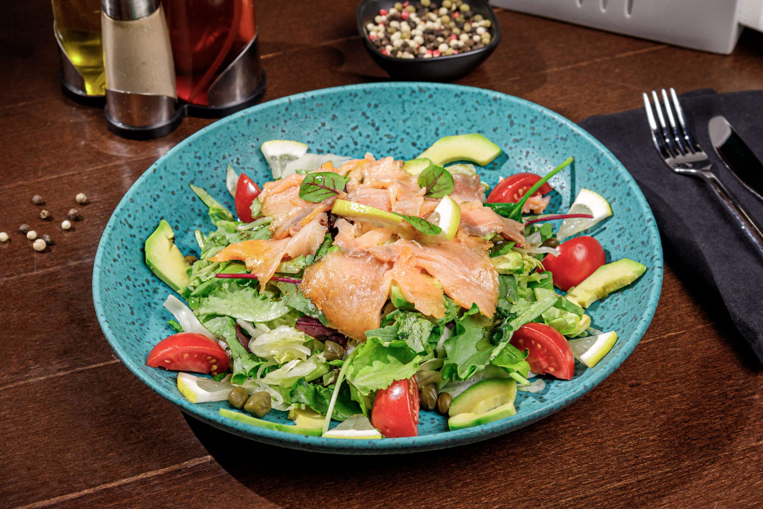 mix salata, somon fume, rosii cherry, capere,dresing, avocado