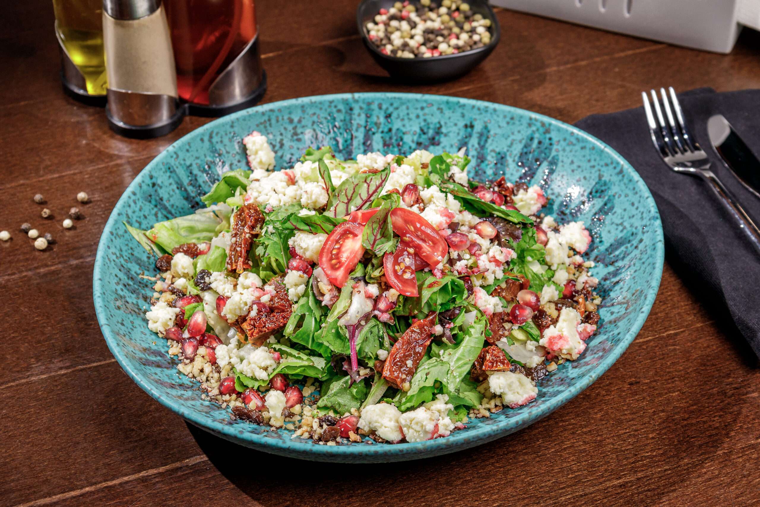 salata verde, rucola, branza de burduf oaie, rodie, nuca, sos de rodie, rossi uscate, stafide
